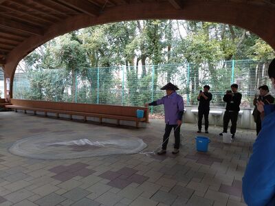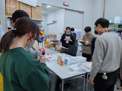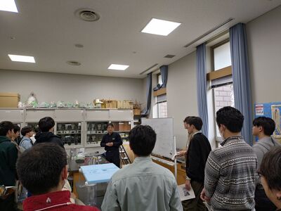 午後は、プラスティネーションのデモンストレーションに続き、採集と標本作製の技術講習を二班体制で実施しました。採集講習では、野外活動前に基礎的な採集技術と生物採集の心得を学び、その後、投網とバケツを手に極寒の野外訓練へ。参加者は水撒きの基本動作を練習した後、網が円形に開くように投げる訓練を繰り返し、熟練者は応用的な投げ方にも挑戦しました。標本作製講習では、まず標本の収蔵庫を見学し、自然史資料が持つ重要性を理解しました。その上で、あらかじめ準備された琵琶湖産の生の魚を使いながらヒレ立て実習を行い、標本写真撮影の基礎を学びました。