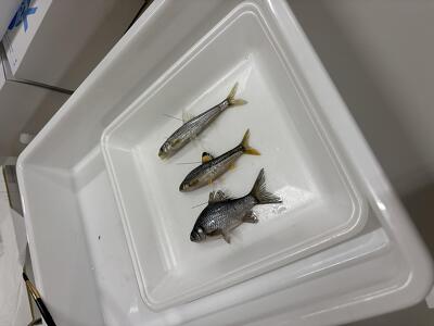 二日目の午前中は、カワムツ、ヌマムツ、ドジョウ類などの標本を観察し、追星や側線菅、鰭条、鱗などの形質を実体顕微鏡で観察しました。初日の講義を踏まえ、同定形質の理解を深めながら種の同定作業を体験しました。